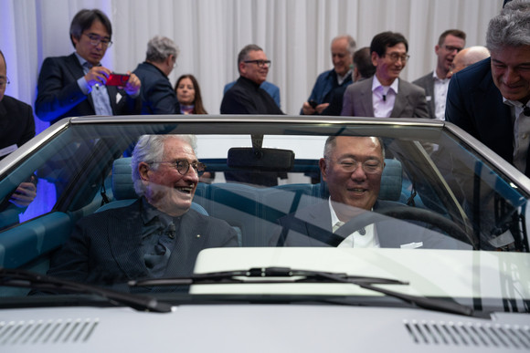 포니 쿠페 복원 차량에 탑승한 디자이너 조르제토 주지아로, 정의선 현대차그룹 회장. ⓒ 현대자동차
