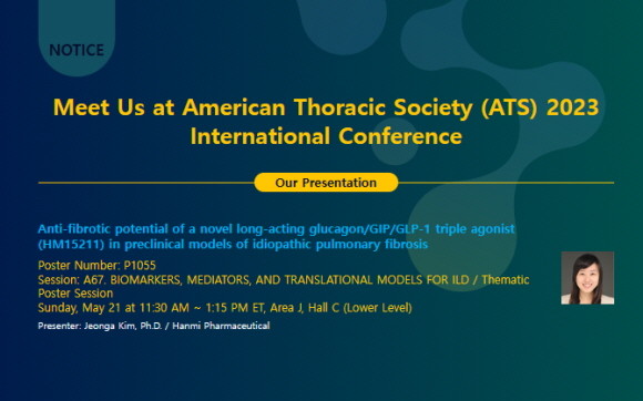 한미약품은 지난 19일부터 24일까지(현지시각) 미국 워싱턴DC에서 열린 미국흉부학회 국제 컨퍼런스 'ATS(American Thoracic Society) 2023'에서 LAPSTriple agonist를 특발성 폐 섬유증(idiopathic pulmonary fibrosis, IPF) 치료제로 개발할 수 있는 가능성을 확인한 연구결과 1건을 포스터로 발표했다.