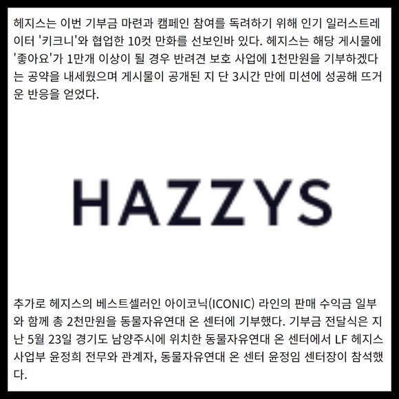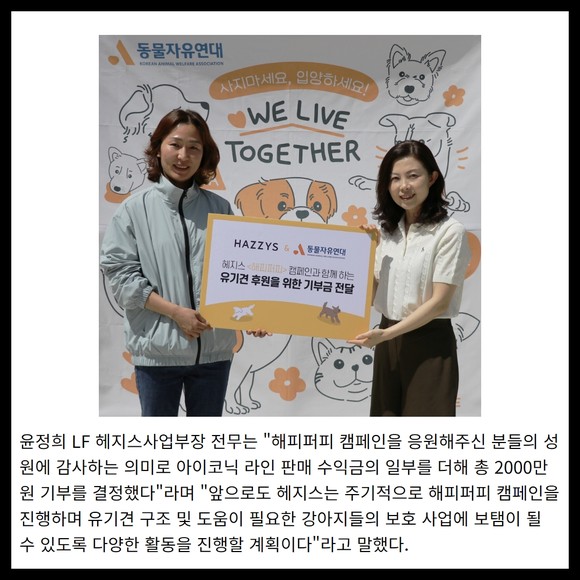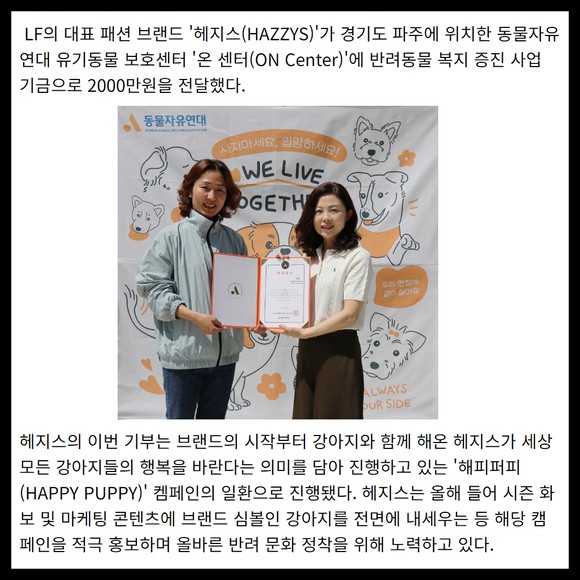 [프라임경제] LF의 대표 패션 브랜드 '헤지스(HAZZYS)'가 경기도 파주에 위치한 동물자유연대 유기동물 보호센터 '온 센터(ON Center)'에 반려동물 복지 증진 사업 기금으로 2000만원을 전달했다.