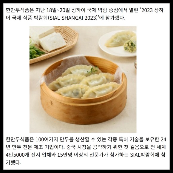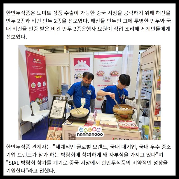 [프라임경제] 한만두식품은 지난 18일~20일 상하이 국제 박람 중심에서 열린 '2023 상하이 국제 식품 박람회(SIAL SHANGAI 2023)'에 참가했다.
