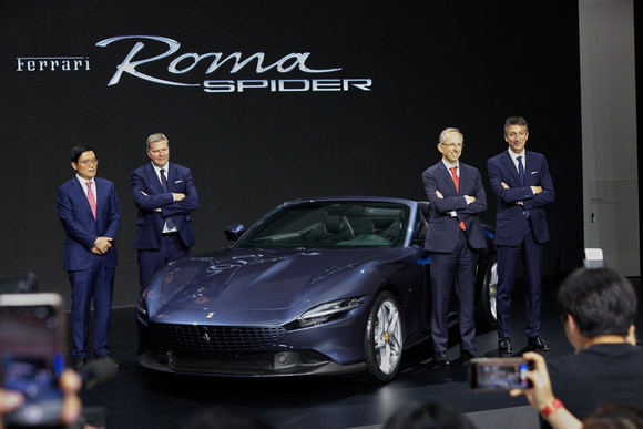 베네데토 비냐 페라리 최고경영자를 비롯한 관계자들이 페라리 로마 스파이더 앞에서 기념촬영을 하고 있다. ⓒ 페라리