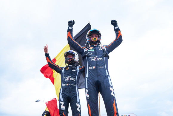현대 월드랠리팀 드라이버 티에리 누빌(오른쪽), 코드라이버 마킨 비데거가 우승하고 기뻐하는 모습. ⓒ 현대자동차