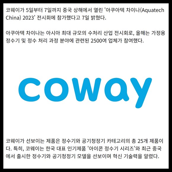 [프라임경제] 코웨이가 5일부터 7일까지 중국 상해에서 열린 '아쿠아텍 차이나(Aquatech China) 2023' 전시회에 참가했다고 7일 밝혔다.