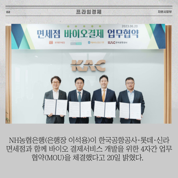 [프라임경제] NH농협은행(은행장 이석용)이 한국공항공사·롯데·신라면세점과 함께 바이오 결제서비스 개발을 위한 4자간 업무협약(MOU)을 체결했다고 20일 밝혔다.