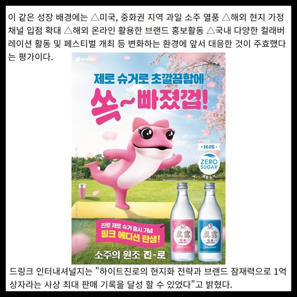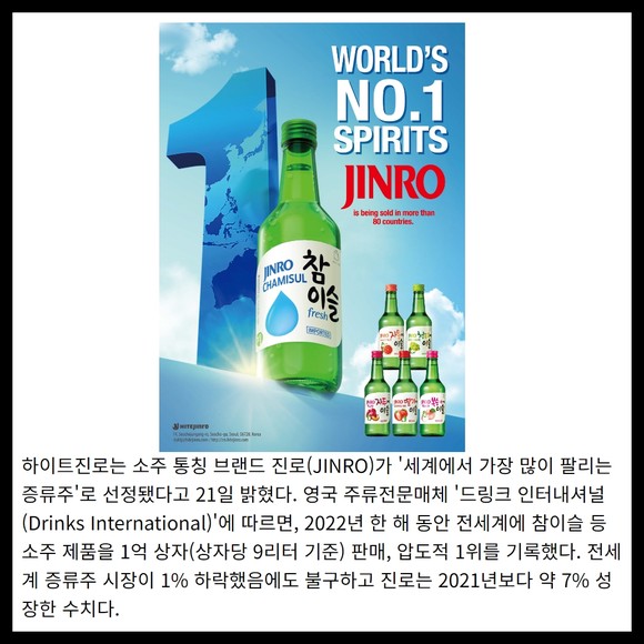 영국 주류전문매체 '드링크 인터내셔널(Drinks International)'에 따르면, 2022년 한 해 동안 전세계에 참이슬 등 소주 제품을 1억 상자(상자당 9리터 기준) 판매, 압도적 1위를 기록했다. 전세계 증류주 시장이 1% 하락했음에도 불구하고 진로는 2021년보다 약 7% 성장한 수치다.
