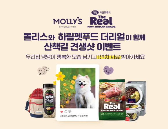 이마트가 운영하는 반려동물 전문 브랜드 '몰리스(MOLLY'S)'가 하림펫푸드, 삼성카드와 협업해 '몰리스클럽 견생샷 이벤트'를 개최한다.