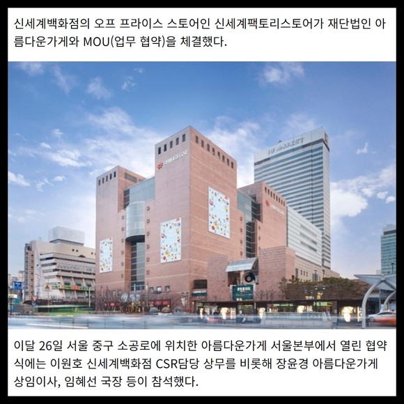 [프라임경제] 신세계백화점의 오프 프라이스 스토어인 신세계팩토리스토어가 재단법인 아름다운가게와 MOU(업무 협약)을 체결했다.