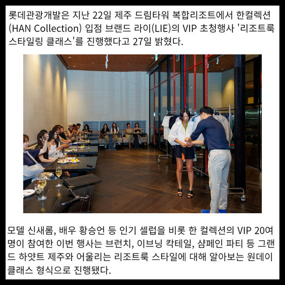 [프라임경제] 롯데관광개발은 지난 22일 제주 드림타워 복합리조트에서 한컬렉션(HAN Collection) 입점 브랜드 라이(LIE)의 VIP 초청행사 '리조트룩 스타일링 클래스'를 진행했다고 27일 밝혔다.