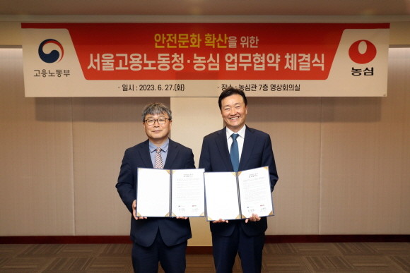 지난 27일, 서울 동작구 소재 농심 본사에서 서울지방고용노동청과 농심이 안전문화 확산을 위한 업무협약을 체결했다. 사진 오른쪽부터 이병학 농심 대표이사, 노길준 서울지방고용노동청장. © 농심