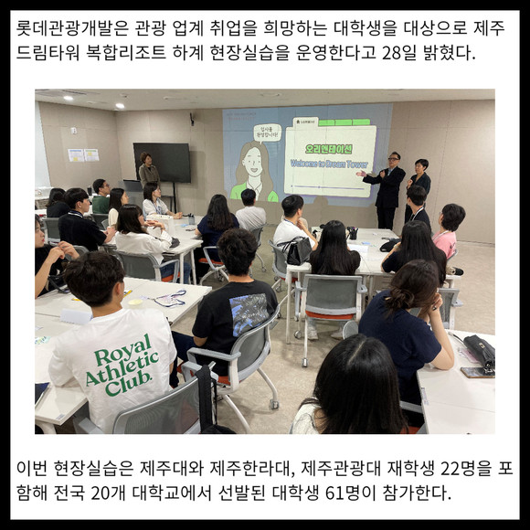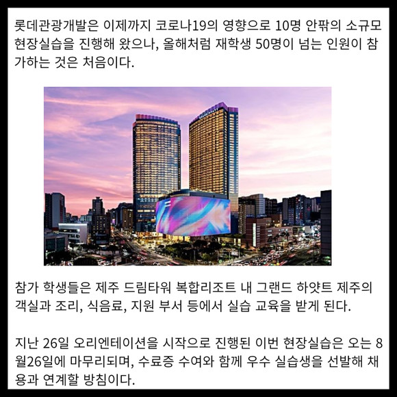 [프라임경제] 롯데관광개발은 관광 업계 취업을 희망하는 대학생을 대상으로 제주 드림타워 복합리조트 하계 현장실습을 운영한다고 28일 밝혔다.