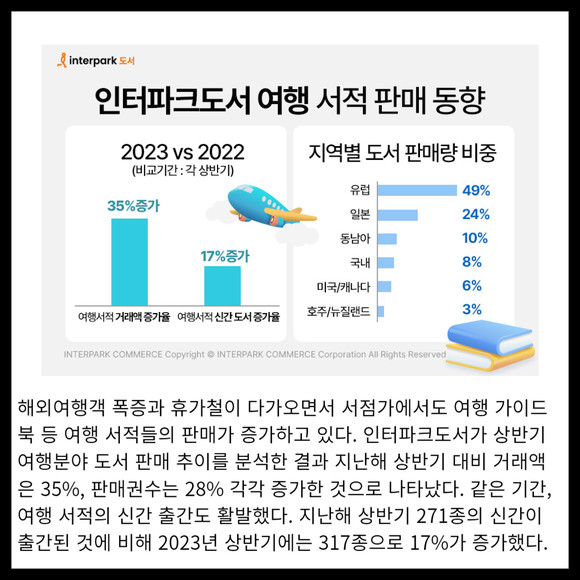 [프라임경제] 해외여행객 폭증과 휴가철이 다가오면서 서점가에서도 여행 가이드북 등 여행 서적들의 판매가 증가하고 있다. 인터파크도서가 상반기 여행분야 도서 판매 추이를 분석한 결과 지난해 상반기 대비 거래액은 35%, 판매권수는 28% 각각 증가한 것으로 나타났다.