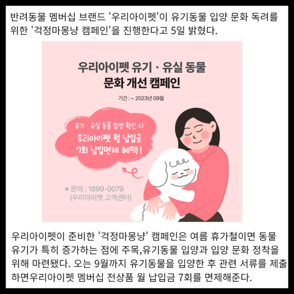 [프라임경제] 반려동물 멤버십 브랜드 '우리아이펫'이 유기동물 입양 문화 독려를 위한 '걱정마몽냥 캠페인'을 진행한다고 5일 밝혔다.