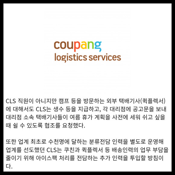 [카드] 쿠팡로지스틱스서비스, 혹서기 배송인력 건강예방 나서