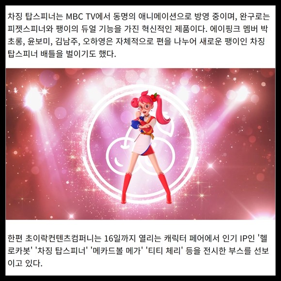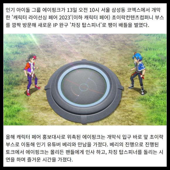 [프라임경제] 인기 아이돌 그룹 에이핑크가 13일 오전 10시 서울 삼성동 코엑스에서 개막한 '캐릭터 라이선싱 페어 2023'(이하 캐릭터 페어) 초이락컨텐츠컴퍼니 부스를 깜짝 방문해 새로운 IP 완구 '차징 탑스피너'로 팽이 배틀을 벌였다.