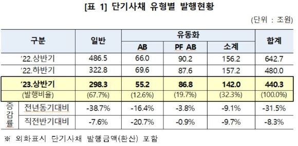 유형별 발행현황으로는 일반 단기사채가 298조3000억원이 발행돼 전년 동기 대비 38.7%증발했다. 유동화 단기사채는 142조원이 발행돼 전년 동기 대비 9.1% 급감했다.