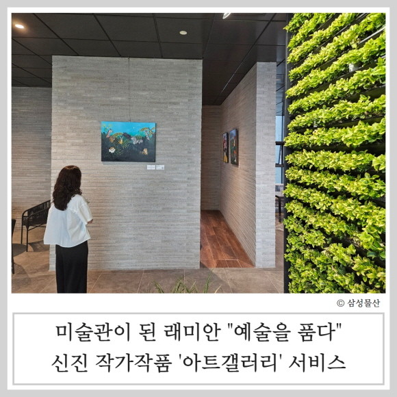 삼성물산은 지난 13일 미술품 경매 플랫폼 회사 '주식회사 플리옥션(이하 플리옥션)'과의 전략적 파트너십을 체결, 래미안 입주민 대상 아트갤러리 서비스를 제공할 예정이다. 플리옥션은 유망한 신진 작가들과의 협업을 통해 사용자들이 손쉽게 미술품을 구매할 수 있도록 모바일 기반 서비스를 제공하는 스타트업이다.