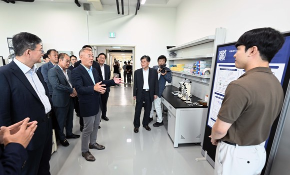 서울대 배터리공동연구센터에서 정의선 회장을 비롯한 관계자들이 학생으로부터 배터리공동연구센터에 대한 설명을 듣고 있다. ⓒ 현대자동차그룹