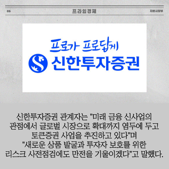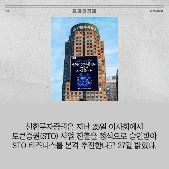 [프라임경제] 신한투자증권은 지난 25일 이사회에서 토큰증권(STO) 사업 진출을 정식으로 승인받아 STO 비즈니스를 본격 추진한다고 27일 밝혔다.