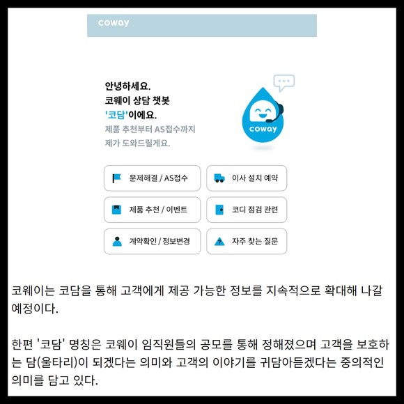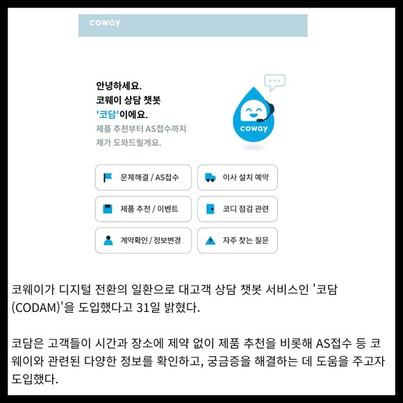 [카드] 코웨이, 대고객 상담 챗봇 서비스 '코담' 도입