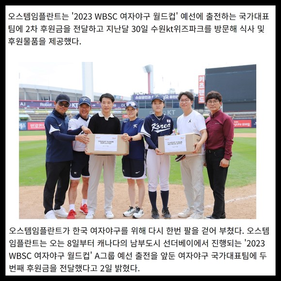 [프라임경제] 오스템임플란트는 '2023 WBSC 여자야구 월드컵' 예선에 출전하는 국가대표팀에 2차 후원금을 전달하고 지난달 30일 수원kt위즈파크를 방문해 식사 및 후원물품을 제공했다.