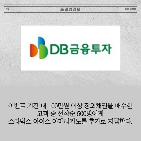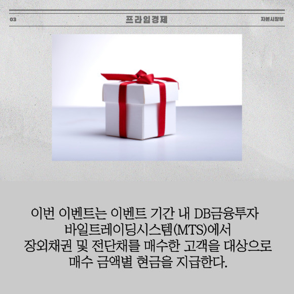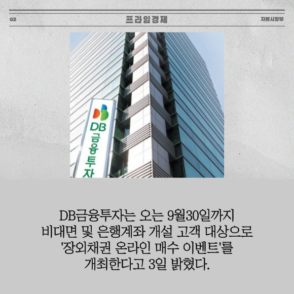 [프라임경제] DB금융투자(016610)는 오는 9월30일까지 비대면 및 은행계좌 개설 고객 대상으로 '장외채권 온라인 매수 이벤트'를 개최한다고 3일 밝혔다.