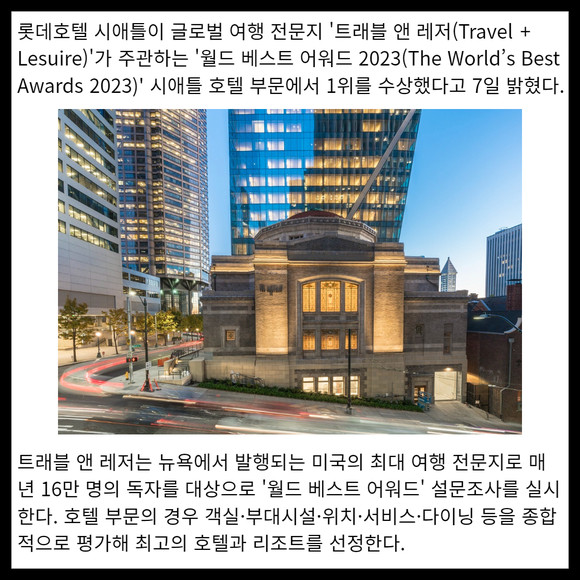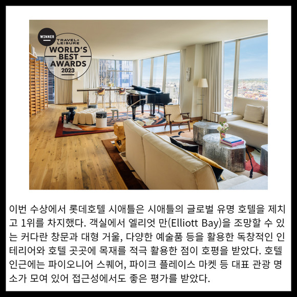 [프라임경제] 롯데호텔 시애틀이 글로벌 여행 전문지 '트래블 앤 레저(Travel + Lesuire)'가 주관하는 '월드 베스트 어워드 2023(The World’s Best Awards 2023)' 시애틀 호텔 부문에서 1위를 수상했다고 7일 밝혔다.
