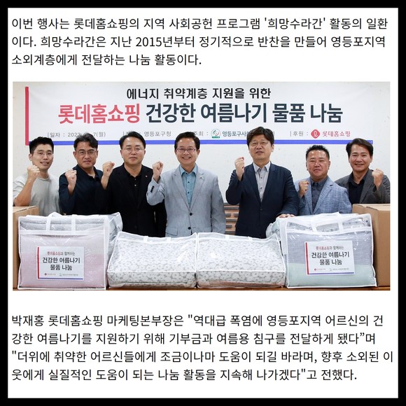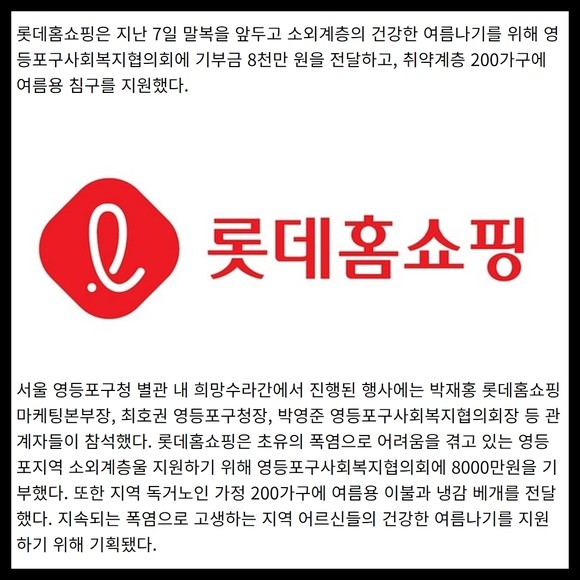[프라임경제] 롯데홈쇼핑은 지난 7일 말복을 앞두고 소외계층의 건강한 여름나기를 위해 영등포구사회복지협의회에 기부금 8000만원을 전달하고, 취약계층 200가구에 여름용 침구를 지원했다.