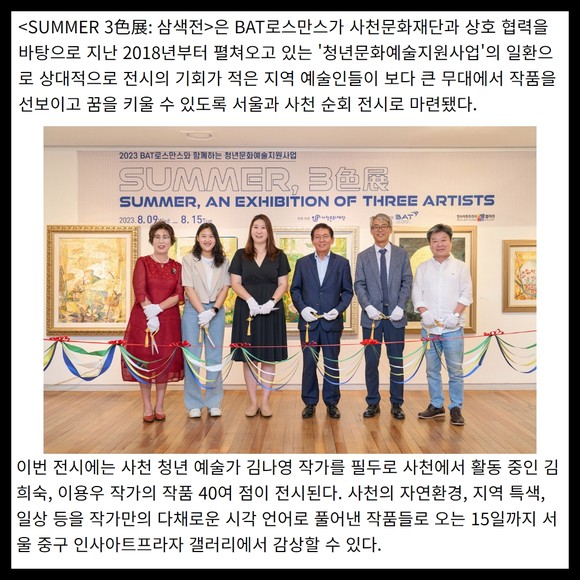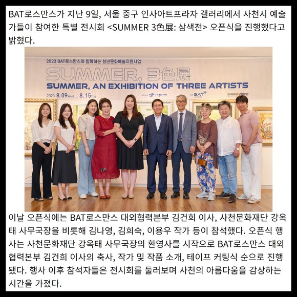 [프라임경제] BAT로스만스가 지난 9일, 서울 중구 인사아트프라자 갤러리에서 사천시 예술가들이 참여한 특별 전시회 <SUMMER 3色展: 삼색전> 오픈식을 진행했다고 밝혔다.