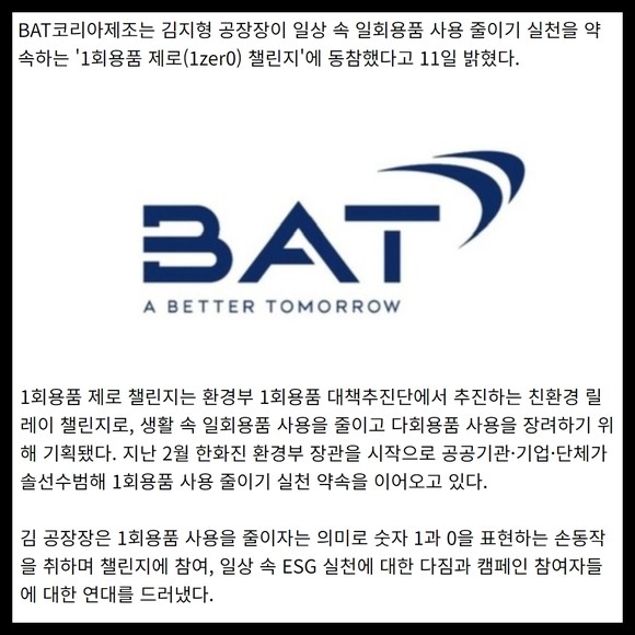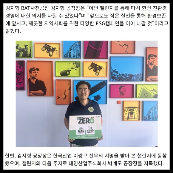 [카드] BAT코리아제조 김지형 공장장 '1회용품 ZERO 챌린지' 동참