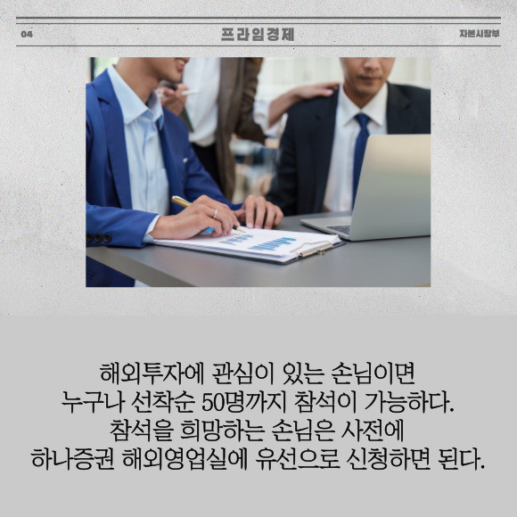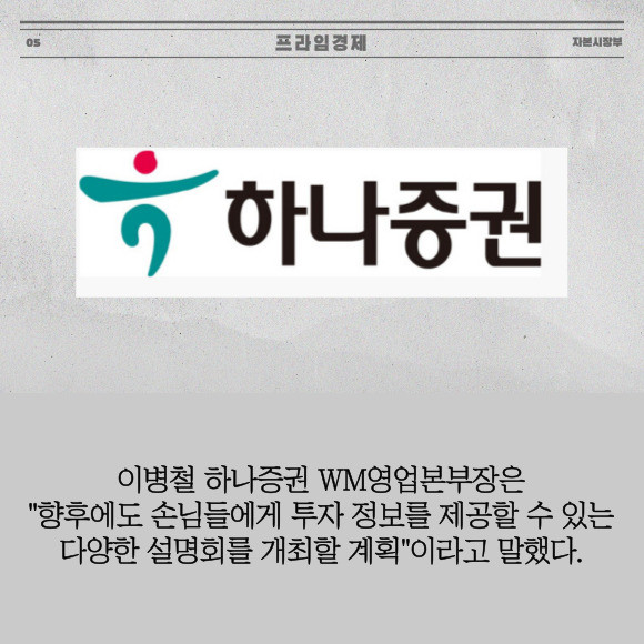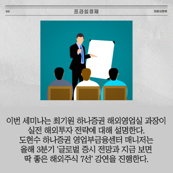 [프라임경제] 하나증권은 오는 29일 오후 7시부터 여의도 전경련회관 2층 토파즈홀에서 해외투자 관련 글로벌 경제 세미나를 개최한다고 11일 밝혔다.