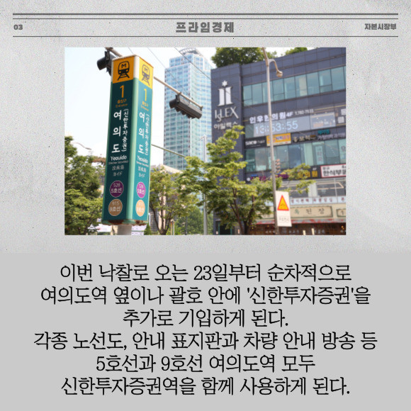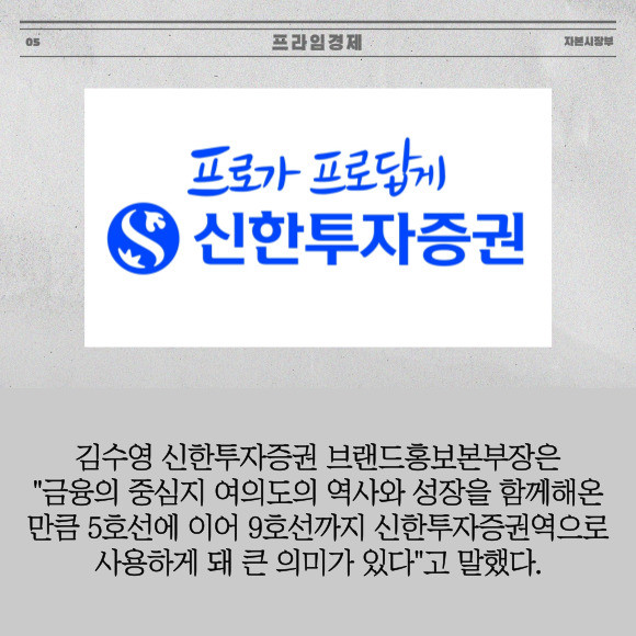 [프라임경제] 신한투자증권은 지하철 5호선에 이어 서울메트로 9호선에서 진행한 여의도역 역명병기 유상판매 입찰에 최종 낙찰됐다고 16일 밝혔다.