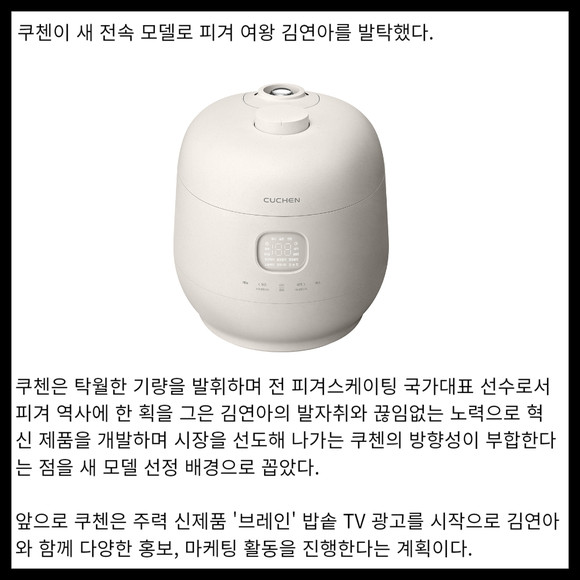 [프라임경제] 쿠첸이 새 전속 모델로 피겨 여왕 김연아를 발탁했다.