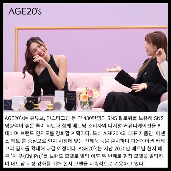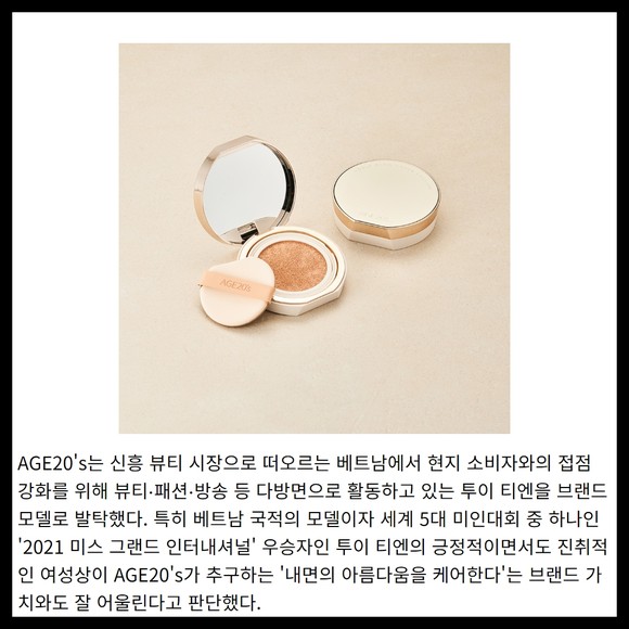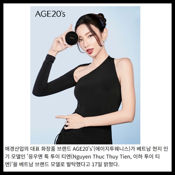[프라임경제] 애경산업의 대표 화장품 브랜드 AGE20's'(에이지투웨니스)가 베트남 현지 인기 모델인 '응우옌 툭 투이 티엔(Nguyen Thuc Thuy Tien, 이하 투이 티엔)'을 베트남 브랜드 모델로 발탁했다고 17일 밝혔다.