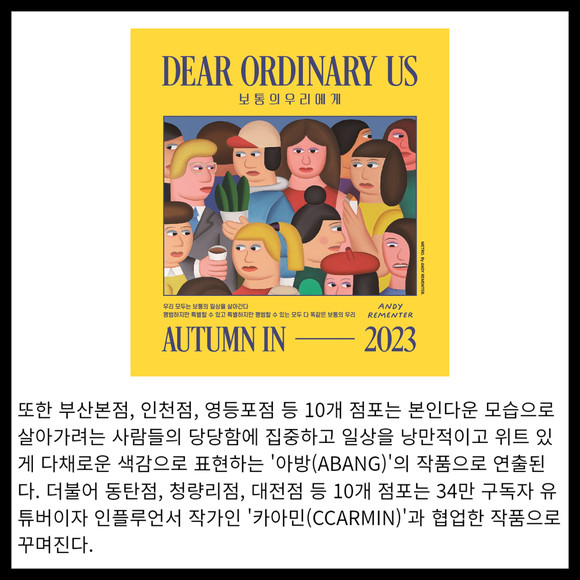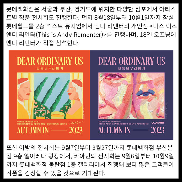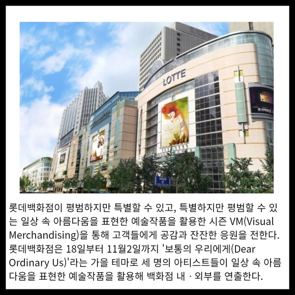 [프라임경제] 롯데백화점이 평범하지만 특별할 수 있고, 특별하지만 평범할 수 있는 일상 속 아름다움을 표현한 예술작품을 활용한 시즌 VM(Visual Merchandising)을 통해 고객들에게 공감과 잔잔한 응원을 전한다. 롯데백화점은 18일부터 11월2일까지 '보통의 우리에게(Dear Ordinary Us)'라는 가을 테마로 세 명의 아티스트들이 일상 속 아름다움을 표현한 예술작품을 활용해 백화점 내ᆞ외부를 연출한다.
