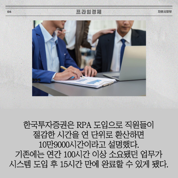 [프라임경제] 한국투자증권은 '로봇 프로세스 자동화(RPA)' 도입으로 업무시간 절감 효과가 연 10만 시간을 단축했다고 21일 밝혔다.