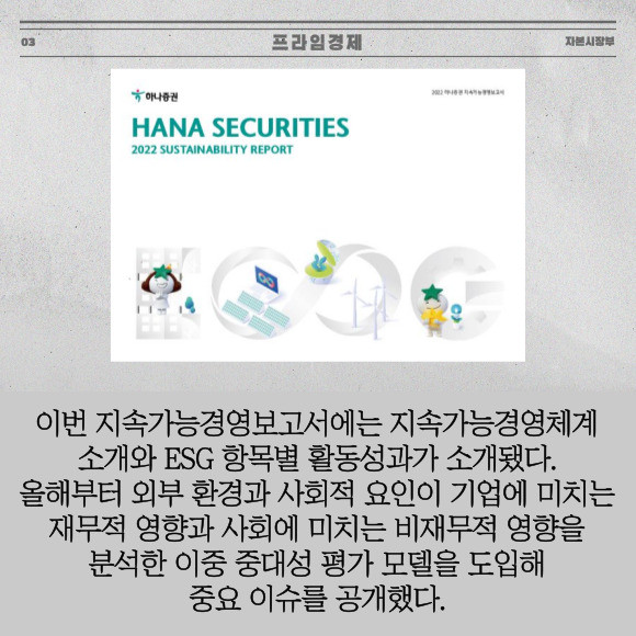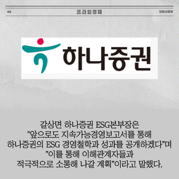 [프라임경제] 하나증권은 2022년 지속가능경영 활동과 성과를 담은 '2022 지속가능경영보고서'를 발간했다고 28일 밝혔다.