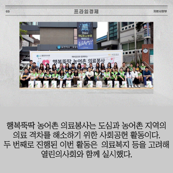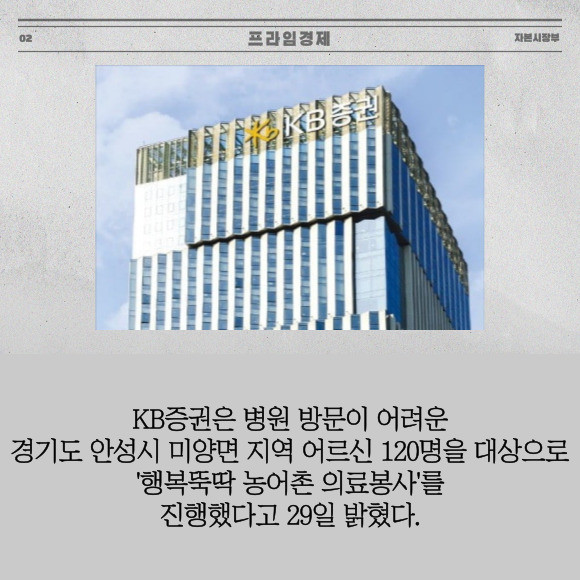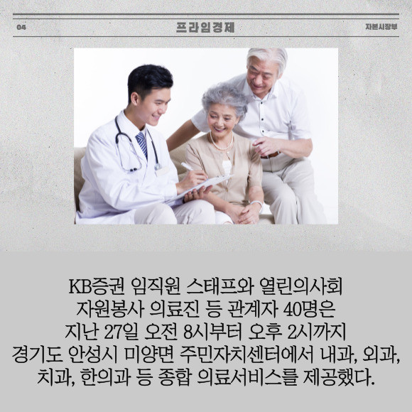 [프라임경제] KB증권은 병원 방문이 어려운 경기도 안성시 미양면 지역 어르신 120명을 대상으로 '행복뚝딱 농어촌 의료봉사'를 진행했다고 29일 밝혔다.