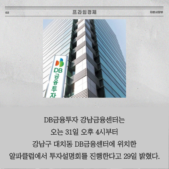 [프라임경제] DB금융투자(016610) 강남금융센터는 오는 31일 오후 4시부터 강남구 대치동 DB금융센터에 위치한 알파클럽에서 투자설명회를 진행한다고 29일 밝혔다.