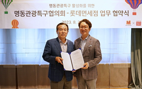 롯데면세점이 지난 28일 서울 중구 롯데면세점 명동본점에서 명동관광특구협의회와 '명동 지역 관광 활성화를 위한 업무협약'을 체결했다. (왼쪽부터) 김병희 명동관광특구협의회장, 김주남 롯데면세점 대표이사. © 롯데면세점