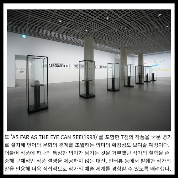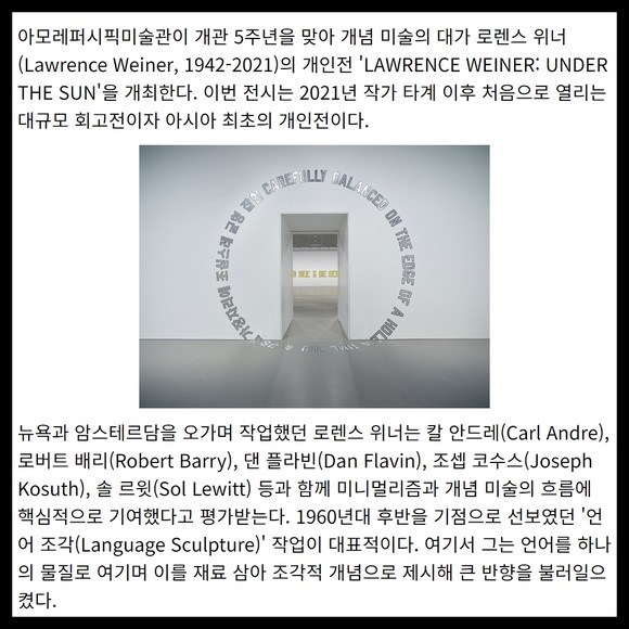 [프라임경제] 아모레퍼시픽미술관이 개관 5주년을 맞아 개념 미술의 대가 로렌스 위너(Lawrence Weiner, 1942-2021)의 개인전 'LAWRENCE WEINER: UNDER THE SUN'을 개최한다. 이번 전시는 2021년 작가 타계 이후 처음으로 열리는 대규모 회고전이자 아시아 최초의 개인전이다.