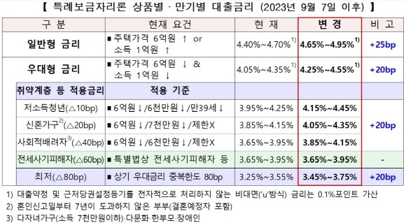 이번 인상 결정으로 일반형은 4.65%(10년)∼4.95%(50년), 우대형(주택가격 6억원 & 소득 1억원 이하)의 경우 4.25%(10년)∼4.55%(50년) 금리가 적용된다. 물론 저소득청년·신혼가구·사회적 배려층(장애인·한부모 가정 등) 등 추가 우대금리(최대 0.8%p)를 적용할 경우 3.45%(10년)∼3.75%(50년)로 이용할 수 있다.