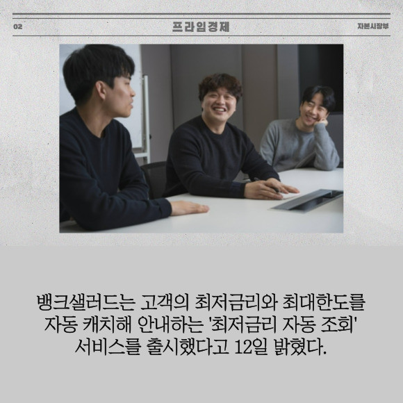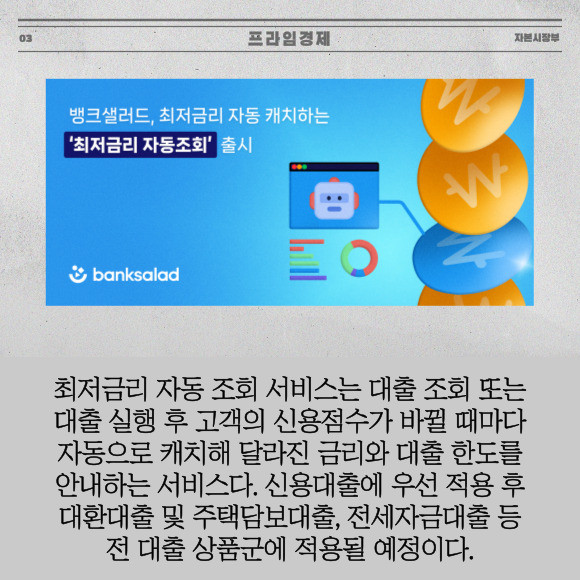 [프라임경제] 뱅크샐러드는 고객의 최저금리와 최대한도를 자동 캐치해 안내하는 '최저금리 자동 조회' 서비스를 출시했다고 12일 밝혔다.