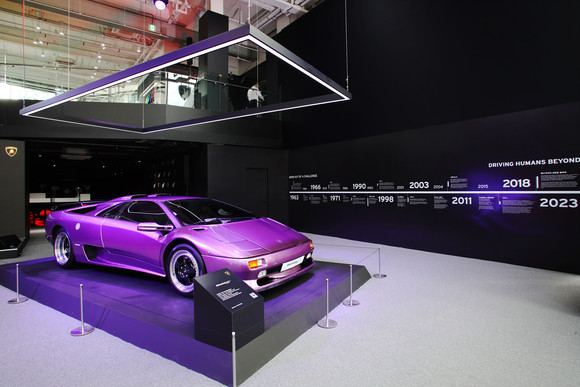디아블로는 쿤타치의 헤리티지를 계승하면서 전자제어식 연료분사 시스템을 비롯한 첨단사양을 대거 탑재해 현대적인 람보르기니 플래그십 모델의 기틀을 다졌으며, 이번에 전시되는 디아블로 SV는 1995년 출시된 디아블로의 고성능 버전이다.