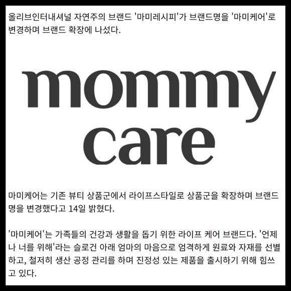 [프라임경제] 올리브인터내셔널 자연주의 브랜드 '마미레시피'가 브랜드명을 '마미케어'로 변경하며 브랜드 확장에 나섰다.