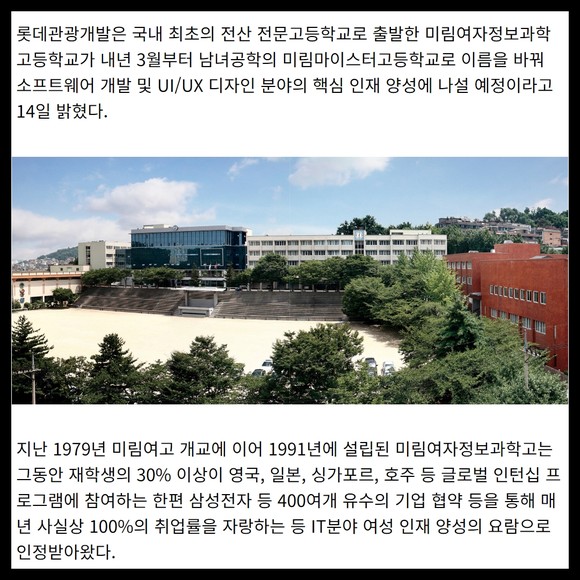 [프라임경제] 롯데관광개발은 국내 최초의 전산 전문고등학교로 출발한 미림여자정보과학고등학교가 내년 3월부터 남녀공학의 미림마이스터고등학교로 이름을 바꿔 소프트웨어 개발 및 UI/UX 디자인 분야의 핵심 인재 양성에 나설 예정이라고 14일 밝혔다.