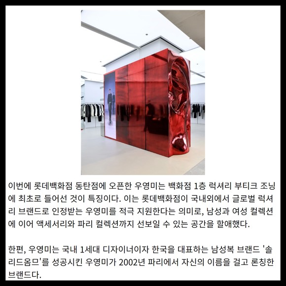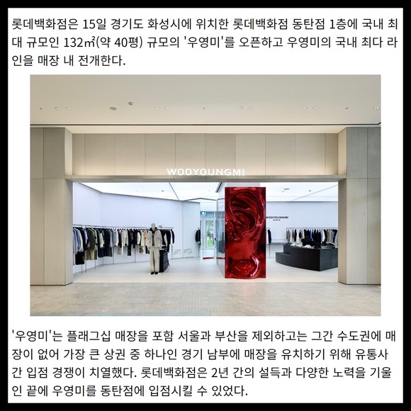 [프라임경제 롯데백화점은 15일 경기도 화성시에 위치한 롯데백화점 동탄점 1층에 국내 최대 규모인 132㎡(약 40평) 규모의 '우영미'를 오픈하고 우영미의 국내 최다 라인을 매장 내 전개한다.