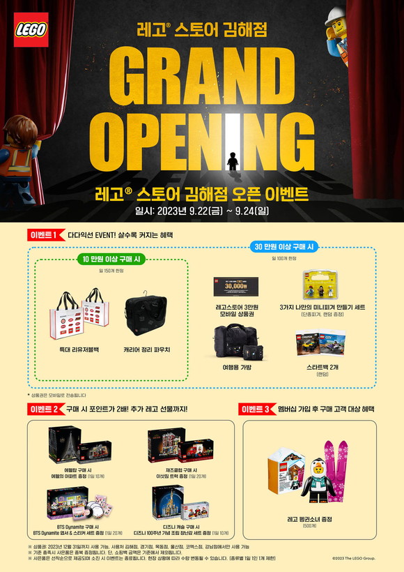 레고코리아는 이번 김해점 오픈을 기념해 오는 22일부터 24일까지 3일간 구매 고객을 대상으로 풍성한 이벤트를 진행한다. 10만원 이상 구매 시 △특대 레고 리유저블백 △캐리어 정리 파우치를, 30만원 이상 구매 시 △레고스토어 3만원 모바일 상품권 △레고 여행용 가방 △단종 미니피겨 3개 △스타트백 2개를 추가 증정한다.