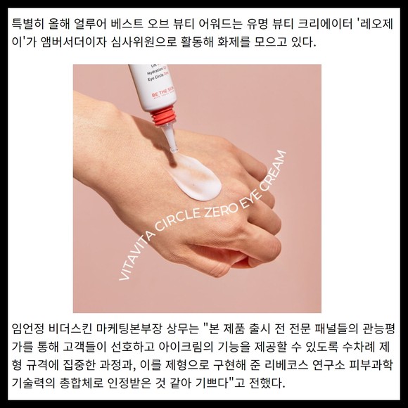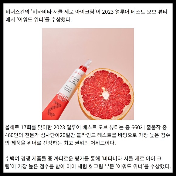 [프라임경제] 비더스킨의 '비타비타 서클 제로 아이크림'이 2023 얼루어 베스트 오브 뷰티에서 '어워드 위너'를 수상했다.