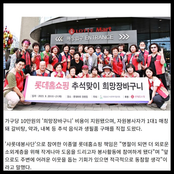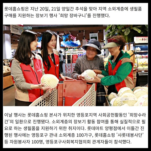 [프라임경제] 롯데홈쇼핑은 지난 20일, 21일 양일간 추석을 맞아 지역 소외계층에 생필품 구매를 지원하는 장보기 행사 '희망 장바구니'를 진행했다.