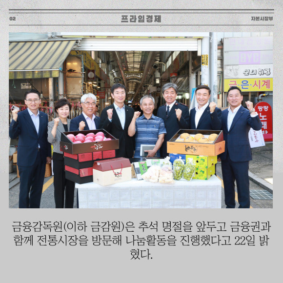 [프라임경제] 금융감독원(이하 금감원)은 추석 명절을 앞두고 금융권과 함께 전통시장을 방문해 나눔활동을 진행했다고 22일 밝혔다.